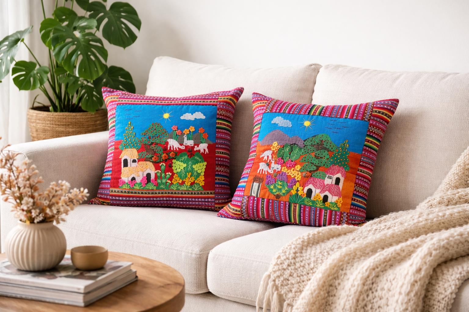 The intricate appliqué work on these pillows beautifully reflects the rich cultural heritage of Peru. With vibrant colors and intricate designs, they are carefully handcrafted, ensuring that each pillow is a one-of-a-kind piece that narrates a tale of tradition and artistic ingenuity.