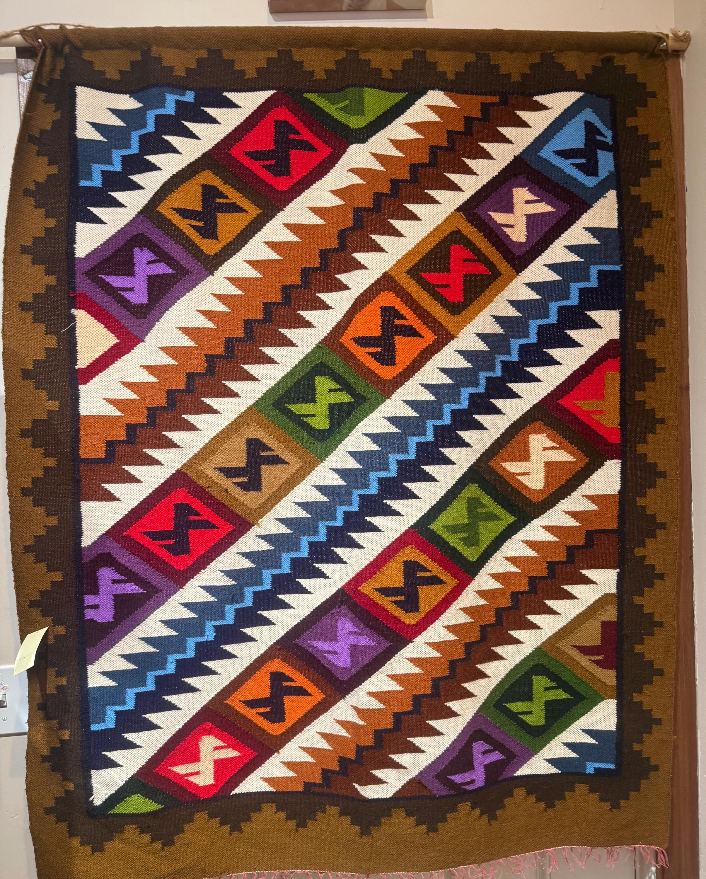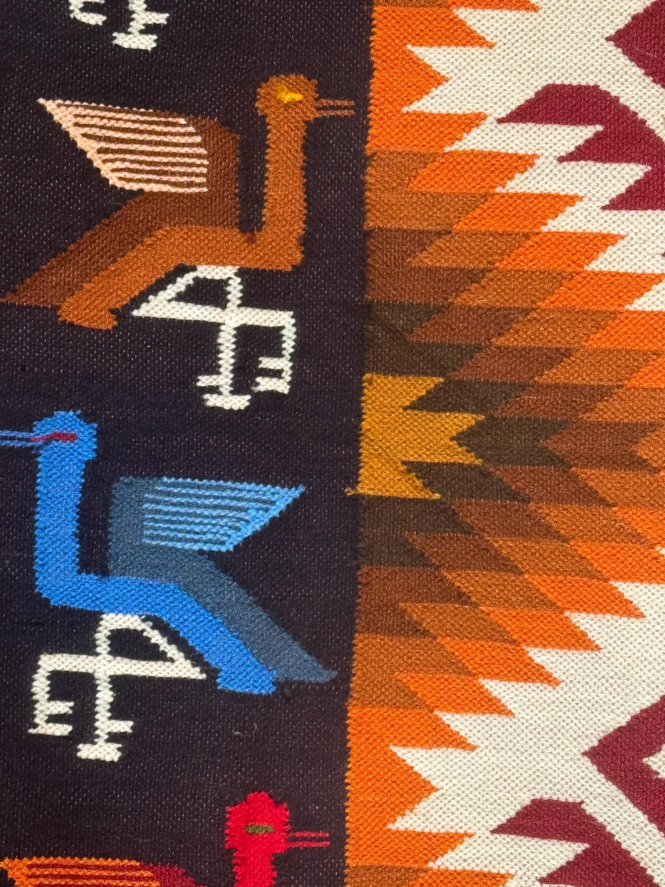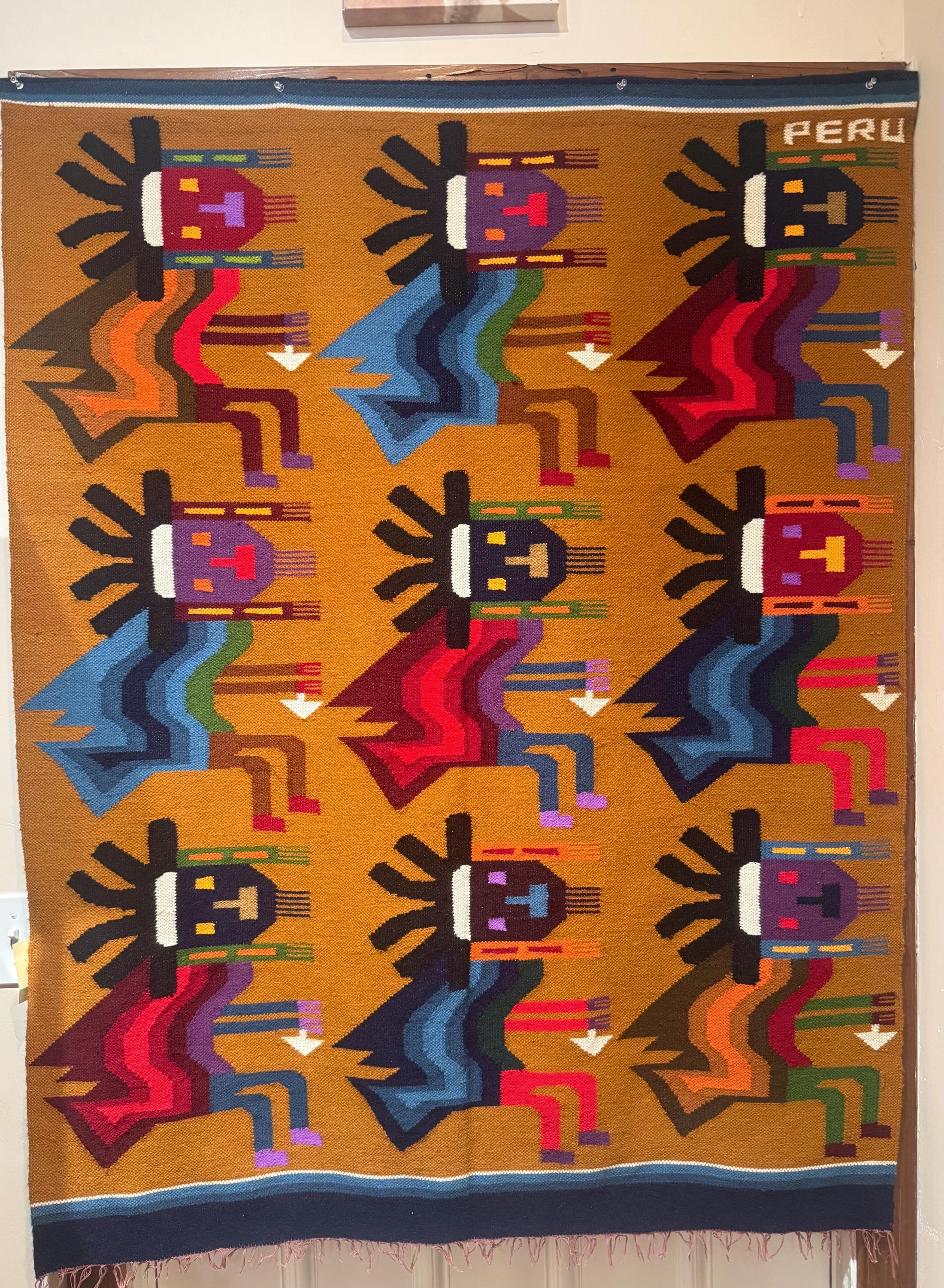 This tapestry is handwoven by Peruvian Indigenous artisans. It is made of pure fibers and features traditional designs inspired by our ancestors from Peru the size is 56x43 inches