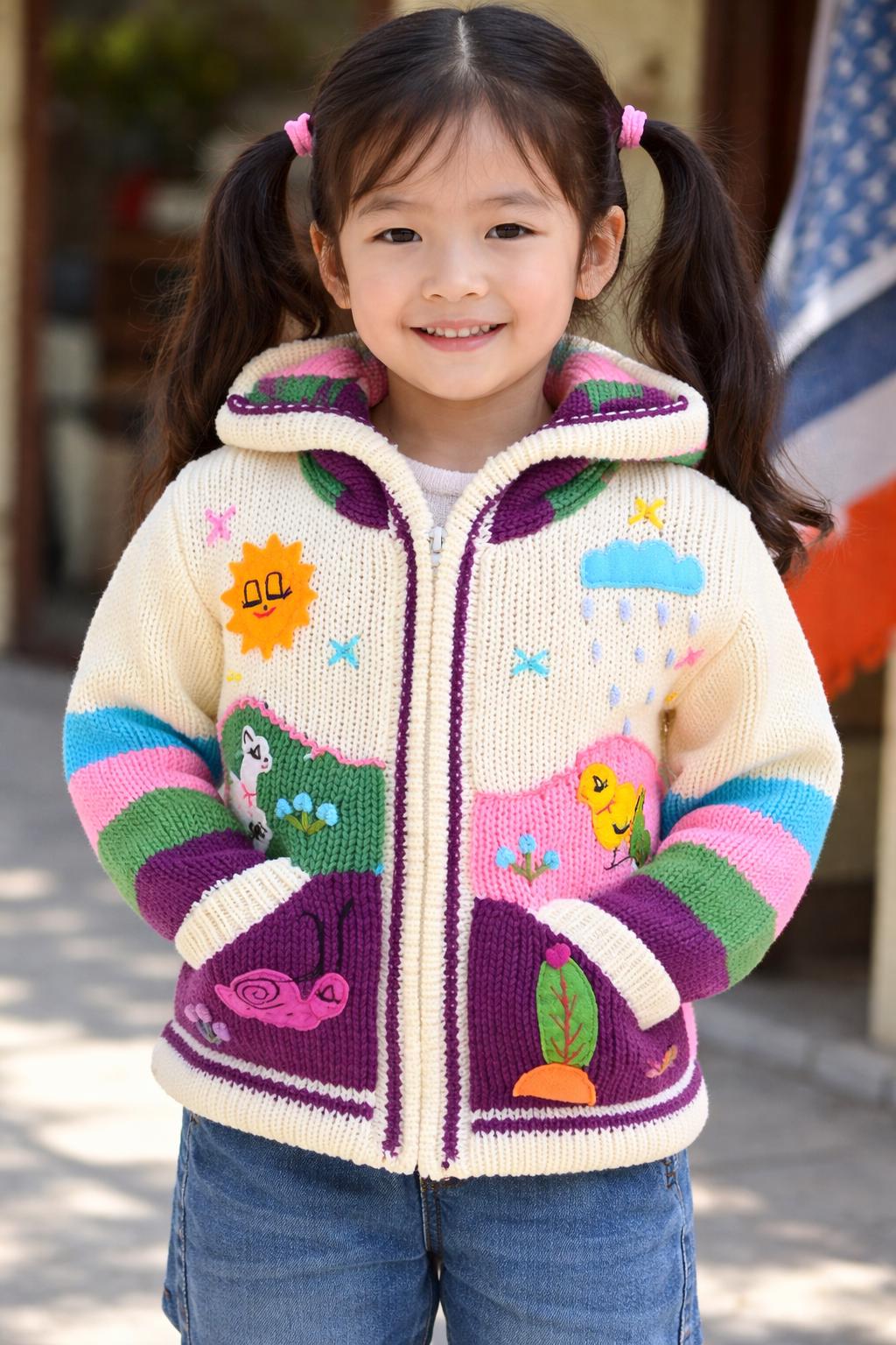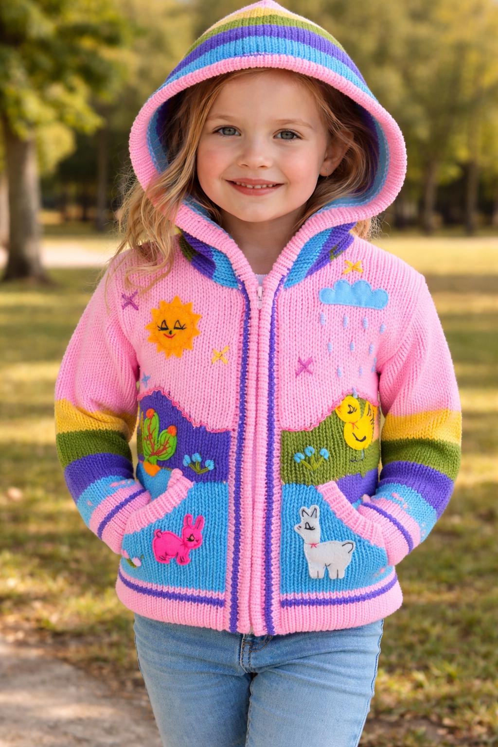 Wrap your little one in the sweetest burst of color and imagination. This adorable zip up sweater is handmade in Peru by talented Peruvian women artisans who pour love and tradition into every stitch.