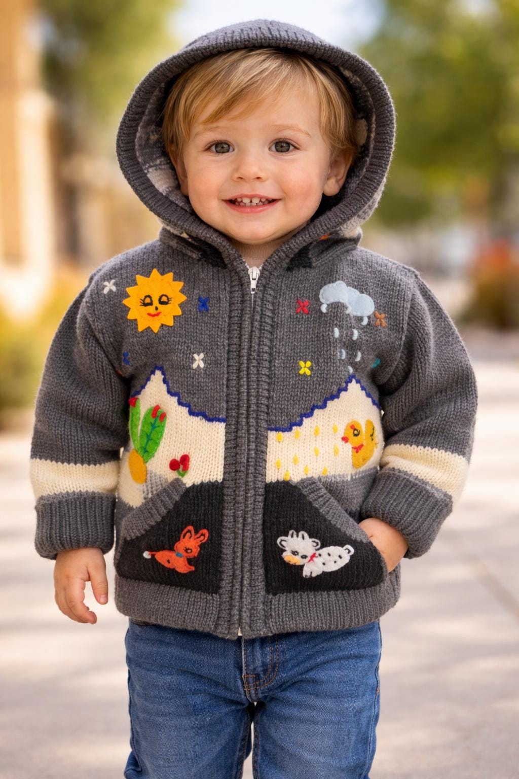 Each sweater is crafted from soft, breathable yarn and features charming hand sewn details like a smiling sun, playful animals, rainy cloud scenes, and bright landscape accents. The vibrant colors and whimsical designs make it a perfect statement piece for everyday wear, family photos, or chilly adventure. Features: