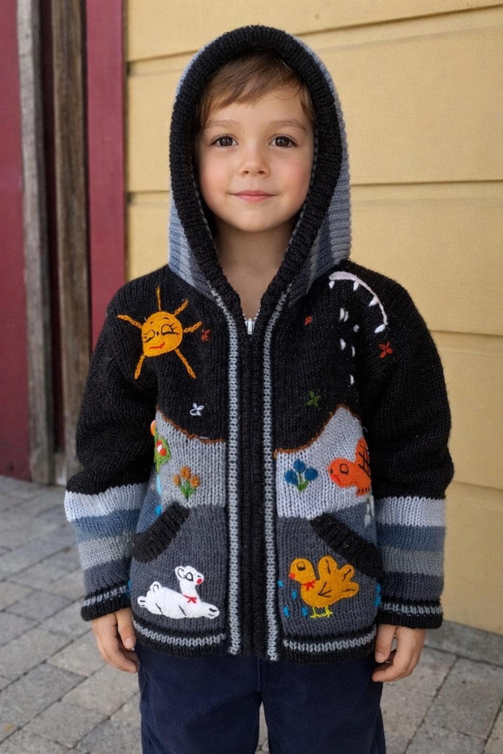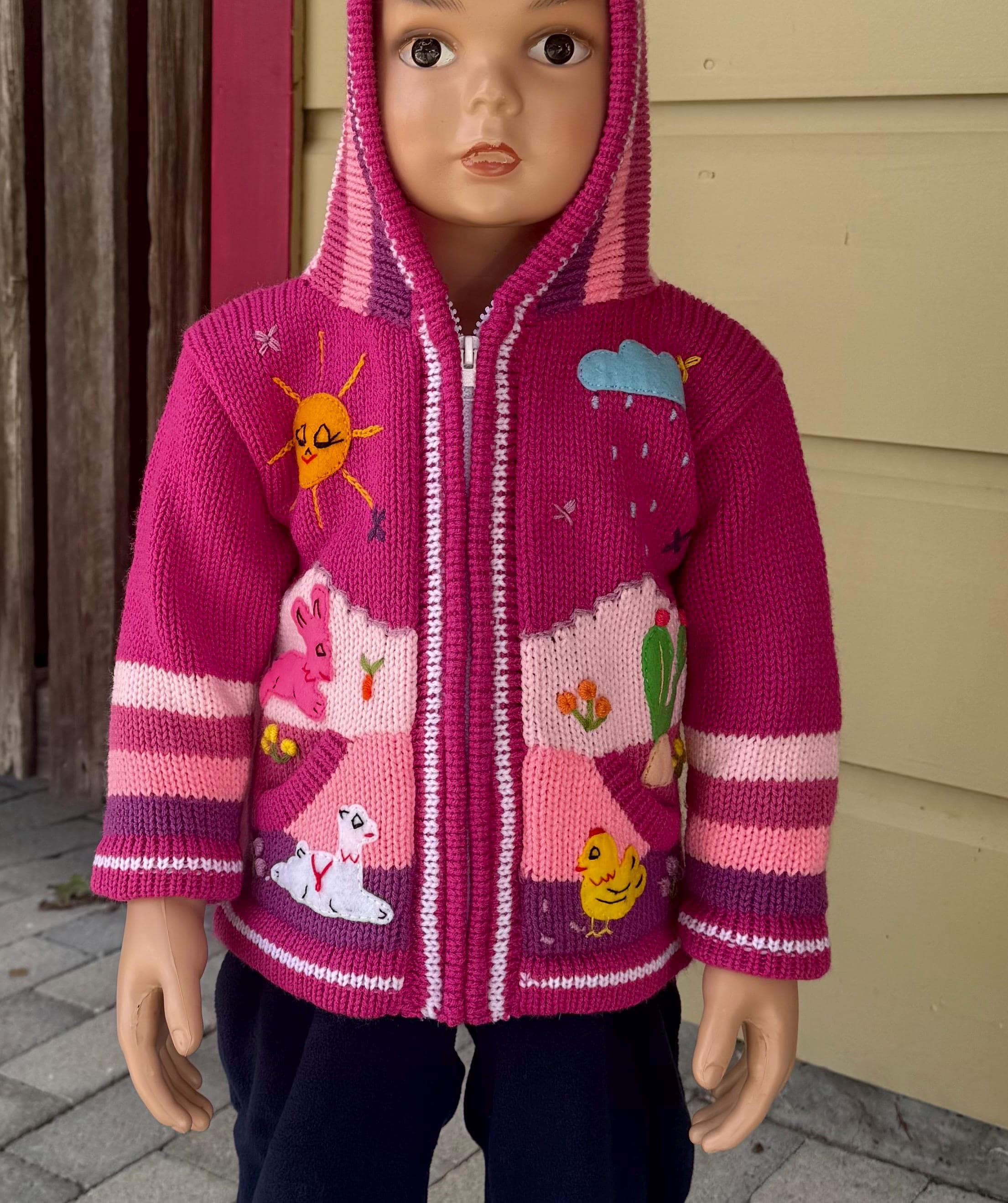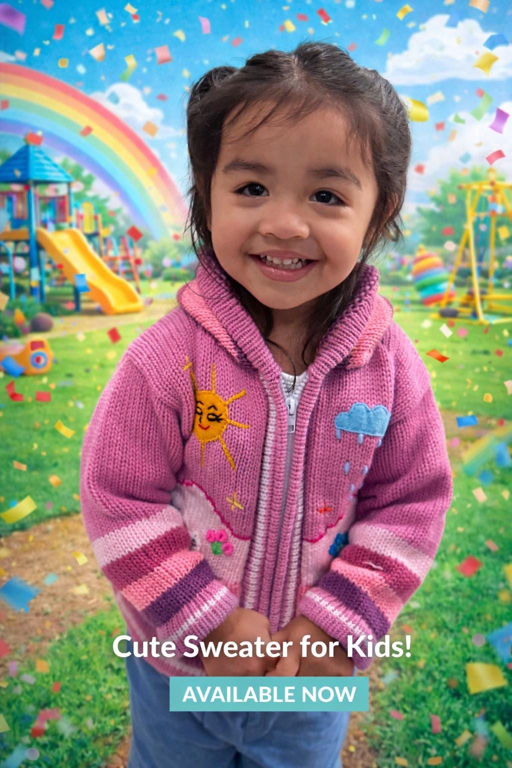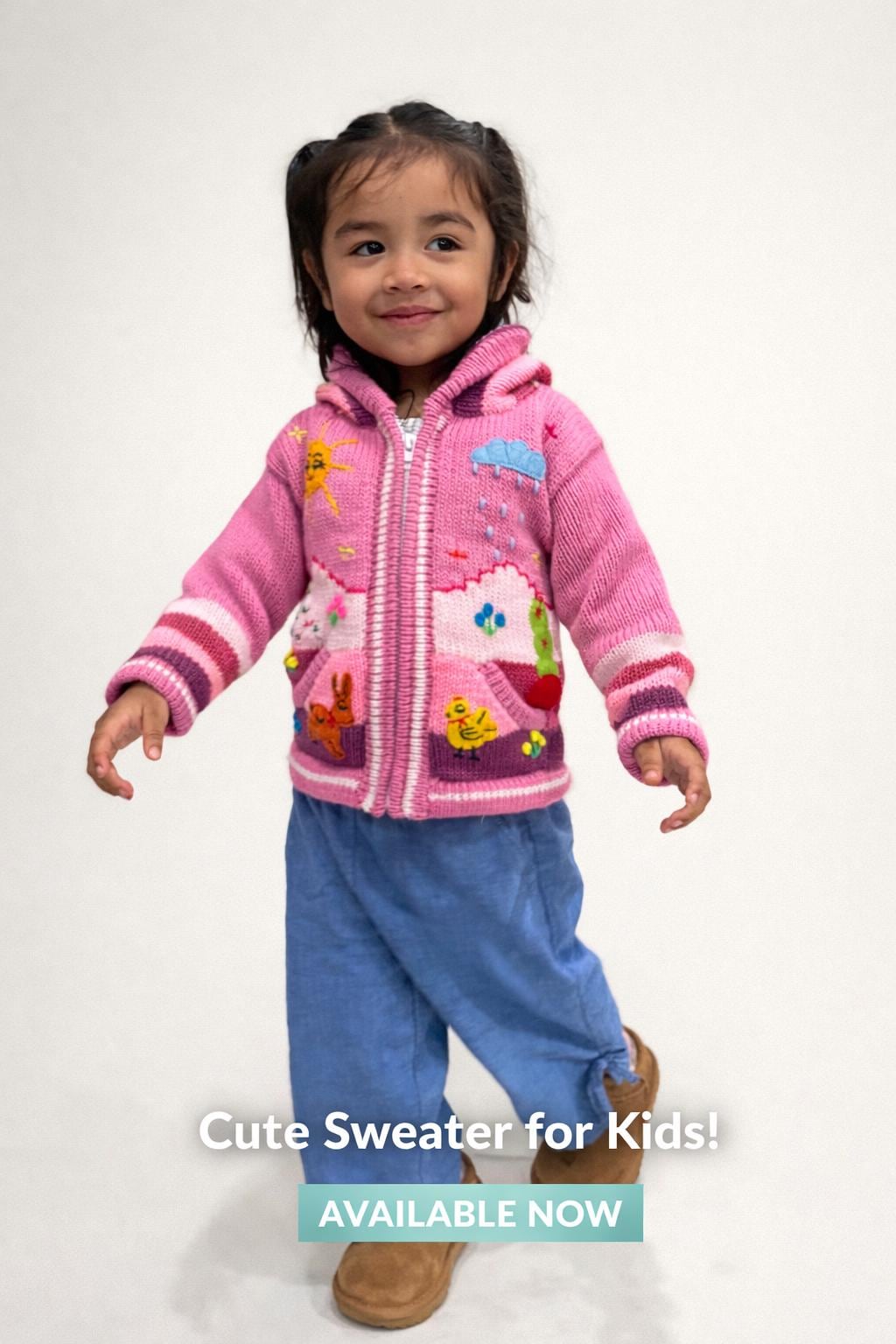 Wrap your little one in the sweetest burst of color and imagination. This adorable zip up sweater is handmade in Peru by talented Peruvian women artisans who pour love and tradition into every stitch.